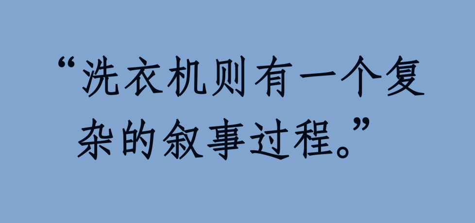 洗衣机有特殊的工作方式。家用电器的运转规律是重复。冰箱保持着一个恒定的温度,一旦超越了这个温度,它就再次运转,再次回复到这个温度,它始终保持着一个标准的温度。空调和电扇打开之后,它就一直让风向重复地来回吹动。但是,洗衣机则有一个复杂的叙事过程,它有一个开端,一个发展,一个高潮,一个结局。也就是说,它有变化,有差异。它像是一部叙事小说一样起起伏伏。它发出的声音充满着变奏:有时候是轻快的水流声,有时候是间断性的嗡嗡声,有时候发出迅疾的低声轰鸣,最后是戛然而止的警报提示音。这些声音不仅变化多端,甚至还会反复出现——它们丝毫不单调,它甚至可以挤进声音艺术的范畴。每一种声音意味着不同的叙事进展——进水,洗涤,漂洗,脱水,再进水,再洗涤,再漂洗,再脱水,直至最后的烘干等等,仿佛这多变的声音在述说一个命运的传奇,仿佛这方盒子里面在上演戏剧。但这方盒子则将这跌宕的过程紧紧地捂住了,这戏剧无法看见,只能倾听。声音对这种被捂住的隐秘之物在传导和再现,它是内在叙事的外化。这是声音和表意完美的语言学结合,也是表象和意义匹配的实践典范。